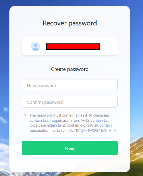 4 - nhập password mới và xác nhận lại password. và nhấm vào Next