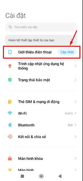 Bước 1: Sau khi cài đặt đã hoàn tất trên giao diện màn hình à Chọn cài đặt à Giới thiệu điện thoại à Click vào cập nhật để upgrade version mới