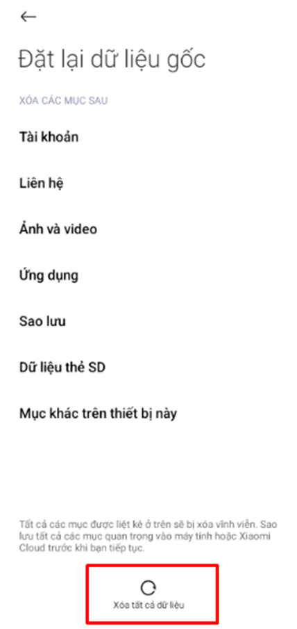 Sau khi hoàn tất log out tài khoản Mi Cloud, ta tiến hành reset điện thoại.